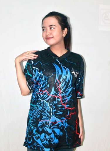 Gaya ala streetwear dengan tipografi besar, warna bold, dan elemen grafis urban. Keren untuk komunitas anak muda.Motif Fullprint Custom